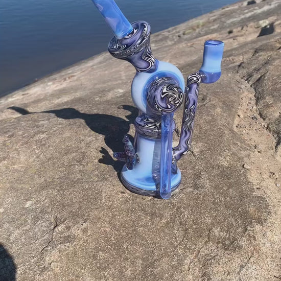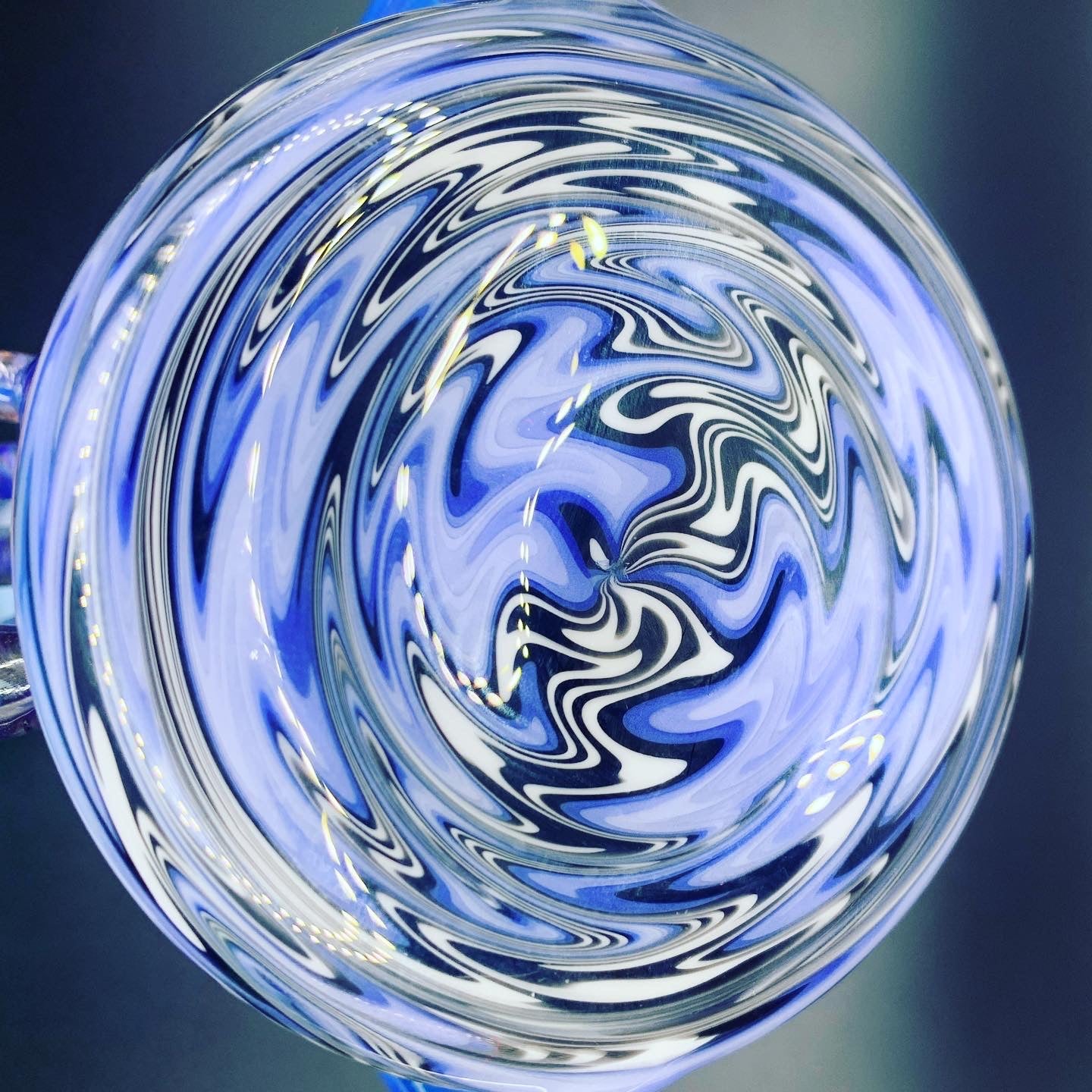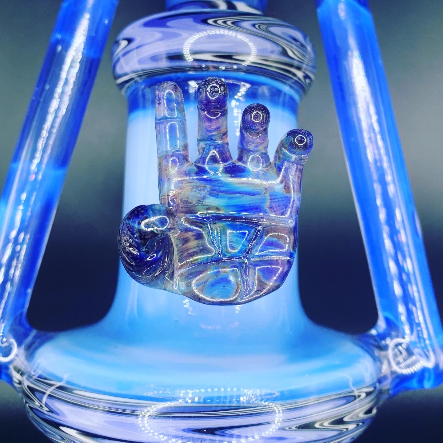 Full colour dipper by EKA Glass. This masterpiece stands at just under 12" tall, has a 14mm joint and features amazing vibrant colours. Gorgeous vac stack by golden gates that was rewigged. The beautiful blue is dense sonic by greasy glass while the "Hamsa" hand is stormy nights by Momka. And although this piece isn't UV active it is still UV reflective under strong UV light!