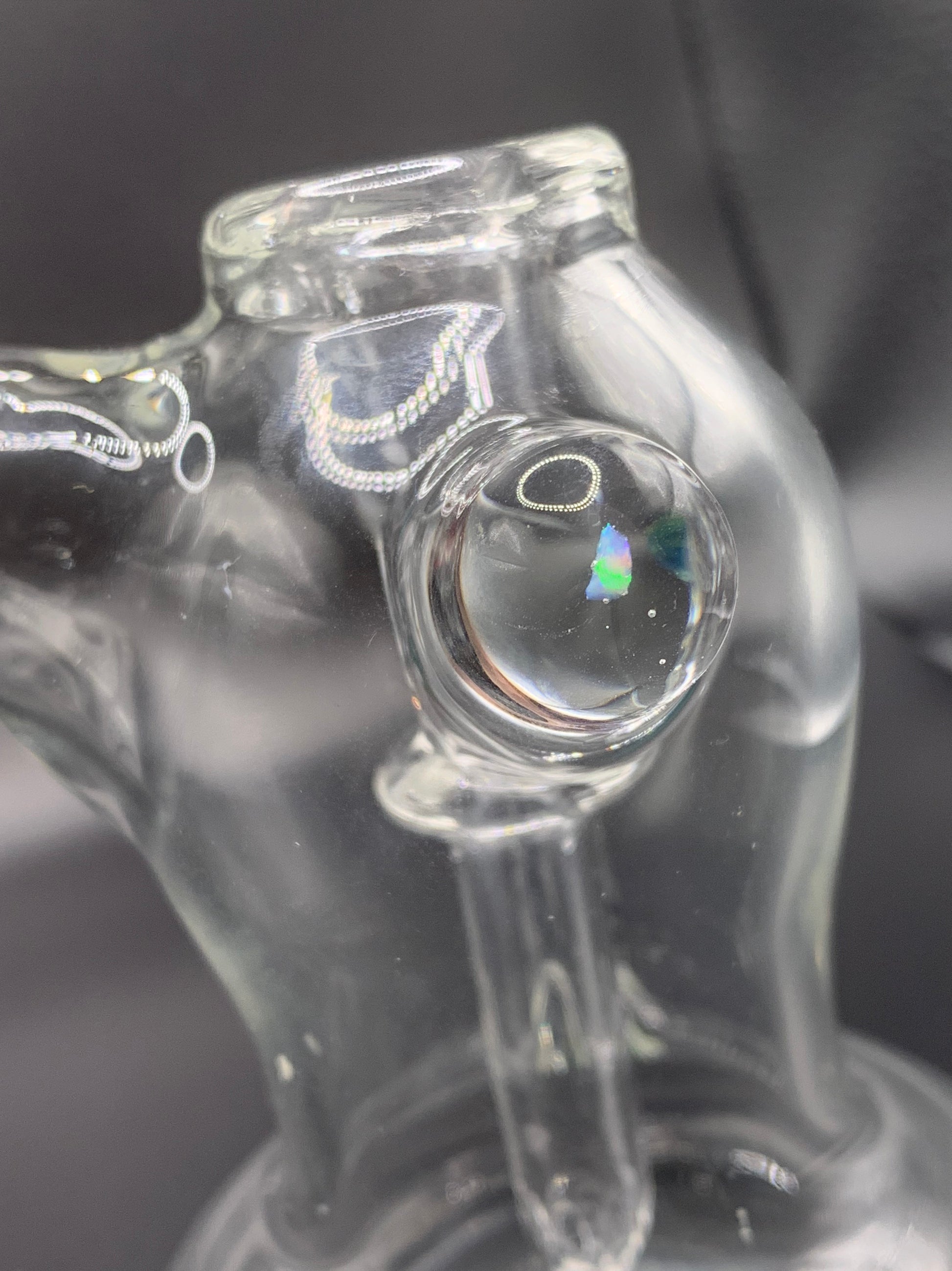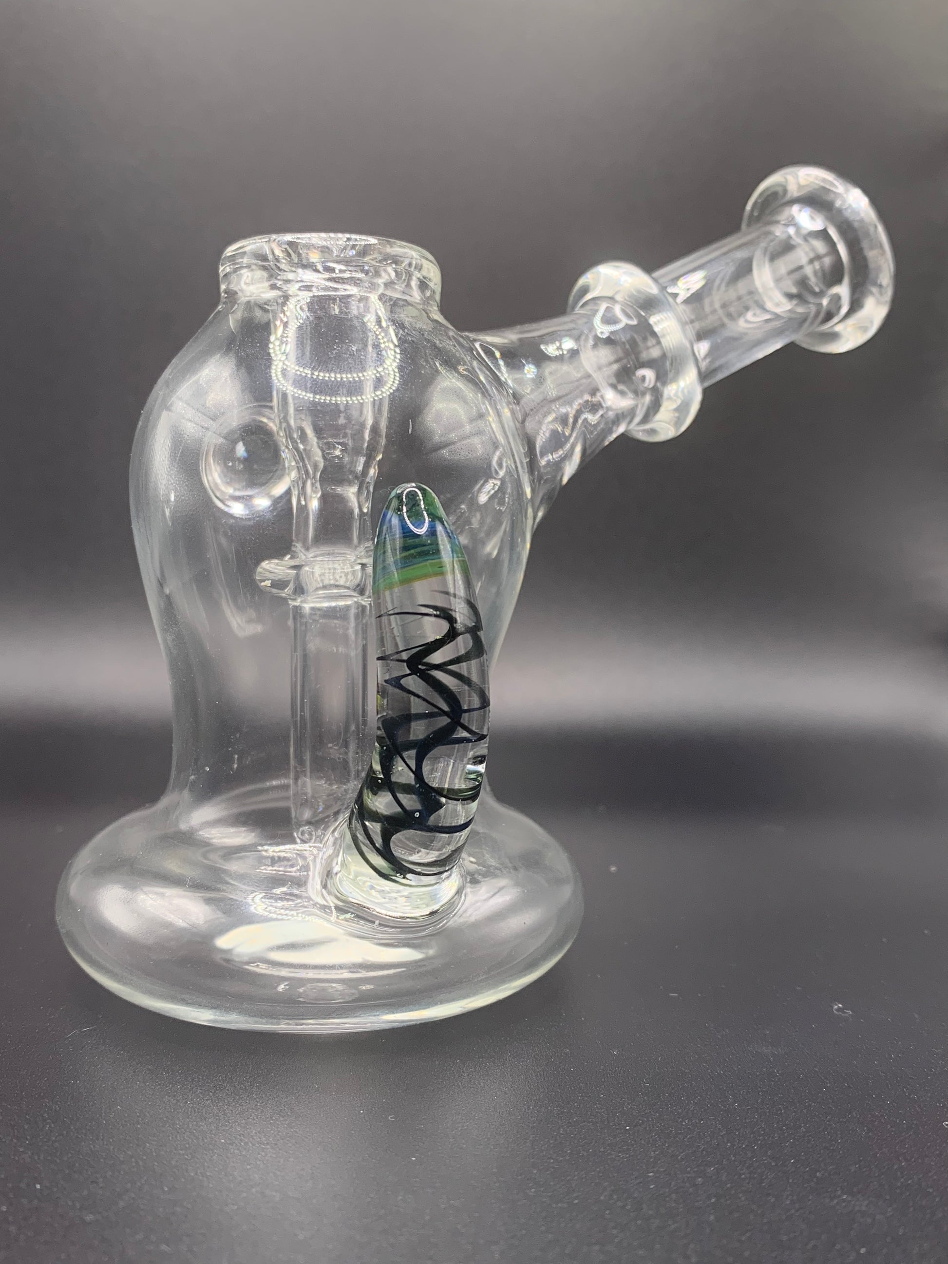 Bubbler style rig accented with horn and opal. These Clear little rigs are the perfect daily drivers or travel piece for anyone looking for something that will not take a lot of space. Get into the heady game without breaking the budget! Made for 10mm joint bangers / Bowls.